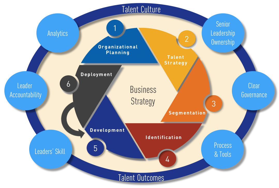 The inner circle centers on key processes. It begins with Organization Planning. Based on the latest business strategy, Organization Planning answers the question: What talent do we need to create a competitive advantage? This is the basis for Talent Strategy. With a talent strategy in place, an organization can segment their talent and identify critical roles, feeder roles and talent pools.